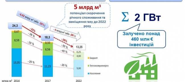 У планах до 2022 року - заощадити ще 5 млрд м3 газу у рік, тобто споживати 13 млрд м3 газу по трьом категоріям споживачів (населення, ТКЕ, бюджетна сфера).