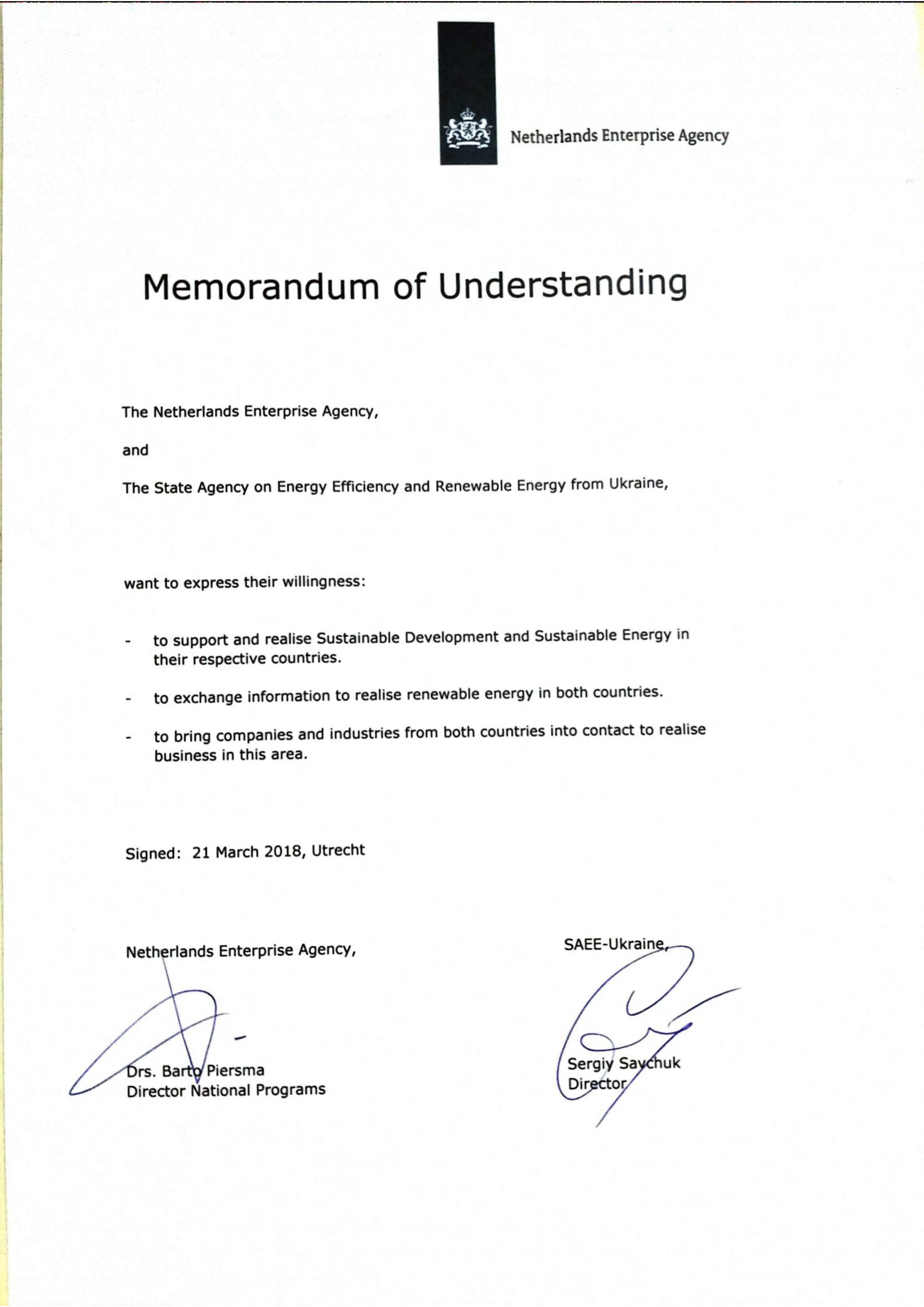 У м. Утрехт (Нідерланди) Голова Держенергоефективності Сергій Савчук та директор Нідерландського агентства підприємництва (RVO) (https://english.rvo.nl) Барто Пірсма підписали Меморандум про взаєморозуміння у відновлюваній енергетиці.