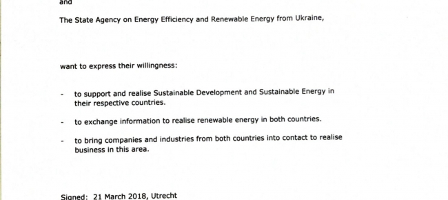 23 03 2018У м. Утрехт (Нідерланди) Голова Держенергоефективності Сергій Савчук та директор Нідерландського агентства підприємництва (RVO) (https://english.rvo.nl) Барто Пірсма підписали Меморандум про взаєморозуміння у відновлюваній енергетиці.