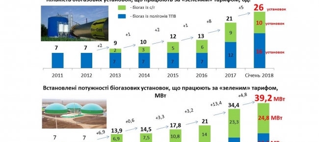 26 03 2018Якщо наприкінці 2014 р. в країні встановлено 14 МВт біогазових установок, які генерують електроенергію за «зеленим» тарифом, то станом на кінець січня 2018 р. маємо майже 40 МВт таких потужностей.