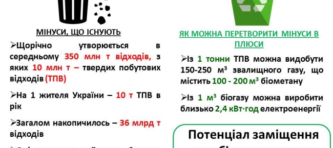 Із 1 тонни цього сміття можна видобути 150-250 м3 звалищного газу, що містить 60-80 % чистого біометану. Таким чином, щорічний потенціал заміщення газу при переробці твердих побутових відходів складає близько 1 млрд м3!