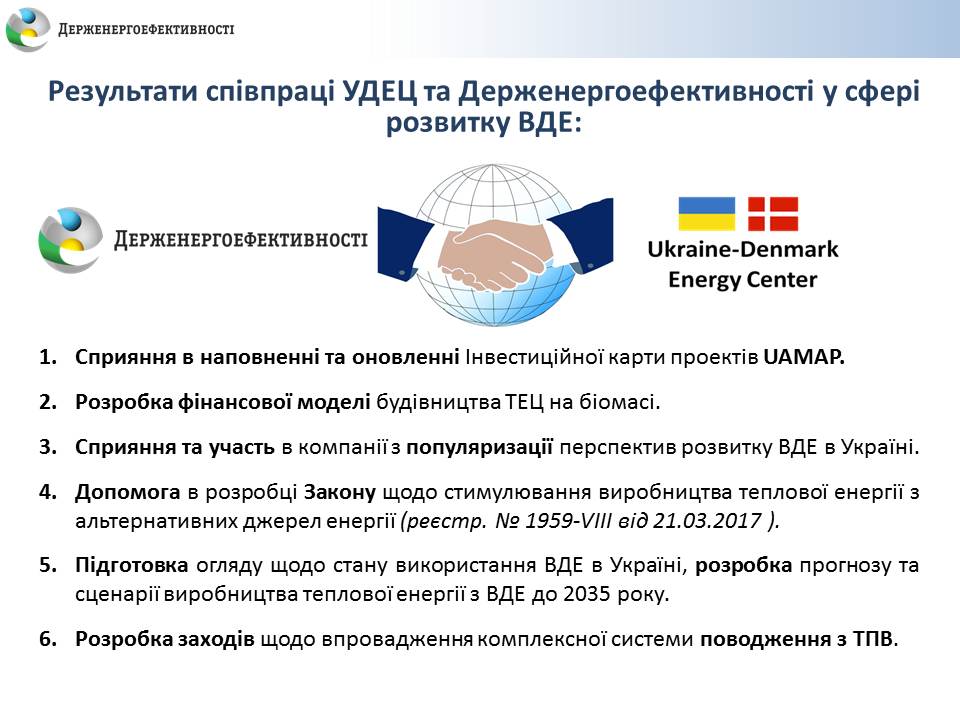 «Данські експерти розробили модель оцінки ефективності системи централізованого теплопостачання, яка стане дієвим інструментом для прийняття рішень щодо модернізації теплових мереж та оптимальним вибором типу генерації теплової енергії. Це допоможе містам заощаджувати на енергоносіях та зменшувати споживання газу», - наголосив Юрій Шафаренко, директор Департаменту відновлюваних джерел енергії Держенергоефективності (https://old.saee.gov.ua).