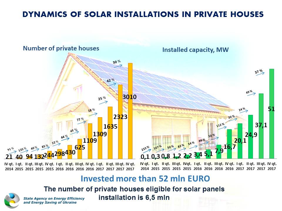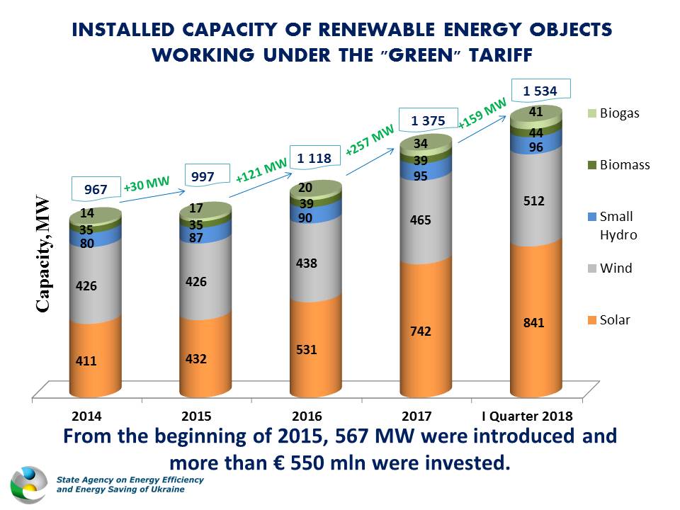 Станом на кінець I кварталу 2018 р. загальна потужність сонячних електростанцій, які працюють за «зеленим» тарифом, становить 841 МВт. Лише за 3 місяці ц.р. встановлено 100 МВт, що складає майже половину потужностей СЕС, введених за весь 2017 рік.