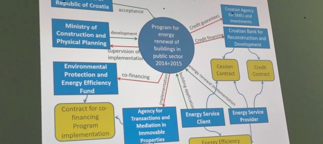 Також, сторони розглянули хорватський досвід реалізації ЕСКО-проектів для термомодернізації бюджетних закладів та джерела їх фінансування, серед яких – співфінансування від Фонду енергоефективності (http://www.fzoeu.hr) та кредитування комерційними банками.