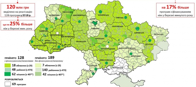 На сьогодні діє 128 місцевих програм здешевлення «теплих кредитів», зокрема, у 18 регіонах, 48 районах та 62 містах.