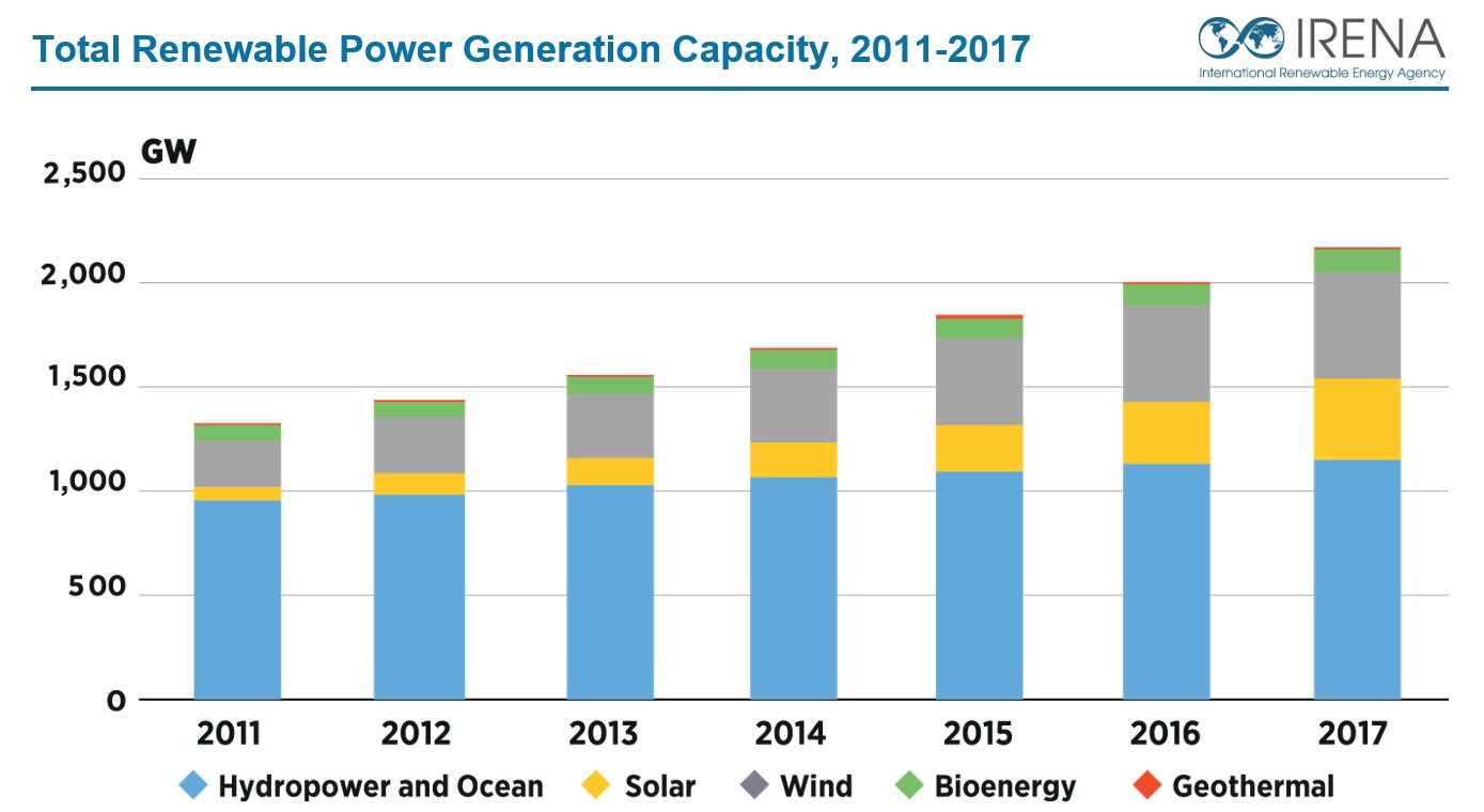 23 04 2018У 2017 р. загальна потужність відновлюваної енергетики збільшилася на 167 ГВт і сягнула 2179 ГВт у всьому світі. Річний приріст становить близько 8,3%. Такі дані опублікувало Міжнародне агентство з відновлюваних джерел енергії (IRENA, http://www.irena.org).