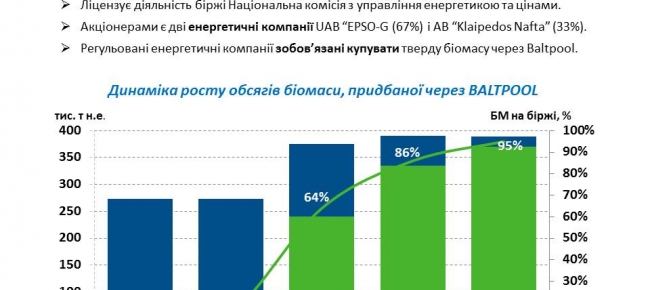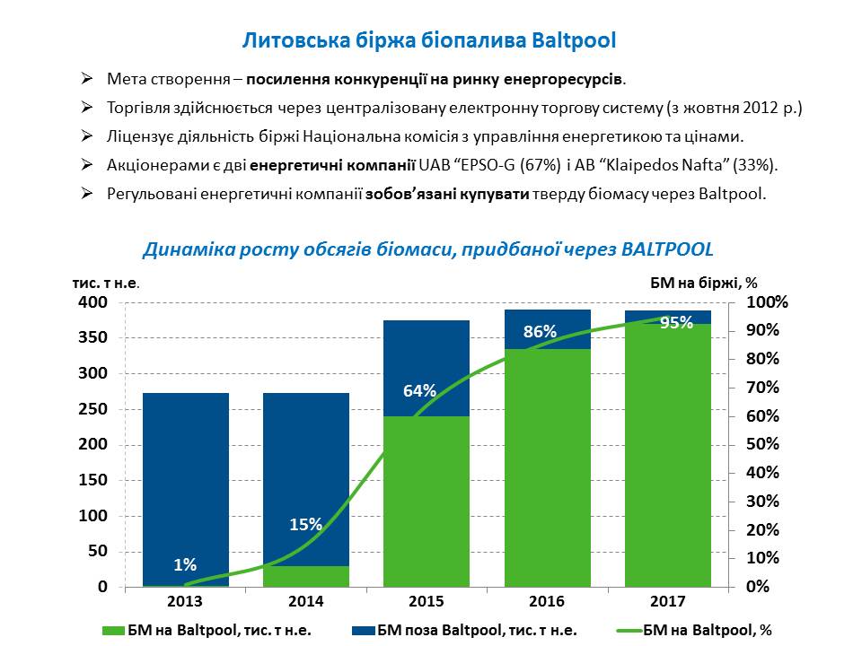 Взірцем у запровадженні такої електронної торгівлі біопаливом є Литва, яка у 2012 р. відкрила біржу біопалива «Baltpool» (https://www.baltpool.eu). Частка біомаси, придбаної через неї, зросла з 1% у 2013 р. до 86% у 2016 році. Вартість біомаси знизилася до 40% у 2015 р. порівняно з 2012 роком.