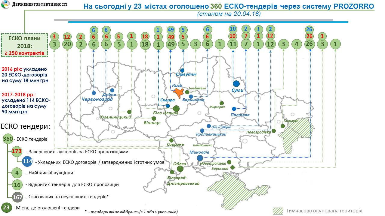 У 2016 р. укладено перші 20 ЕСКО-договорів на суму понад 18 млн гривень. Із моменту запуску спеціального модулю у Системі публічних електронних закупівель «PROZORRO» (https://prozorro.gov.ua) із жовтня 2017 р. і по сьогодні, додатково оголошено 360 ЕСКО-тендерів, а 114 договорів на суму понад 90 млн гривень вже укладено або знаходяться на фінальній стадії підписання.