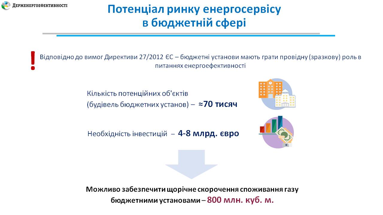 Цю тезу підтвердив і Віктор Галасюк - Голова Комітету ВРУ з питань промислової політики та підприємництва: «ЕСКО - одна із найбільших інвестиційних ніш, у тому числі для залучення іноземних капіталовкладень. Мова йде саме про глибинну енергомодернізацію бюджетних установ».