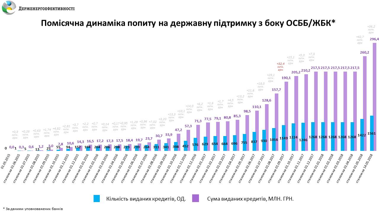 Зокрема, за тиждень 107 ОСББ залучили 27 млн грн. на енергоефективні заходи у багатоповерхівках. Це удвічі більше, ніж за увесь травень 2017 року (82 ОСББ отримали 11,6 млн грн. кредитів) та у 20 разів більше, ніж у травні 2016 року (16 ОСББ одержали 1,3 млн грн. кредитів).