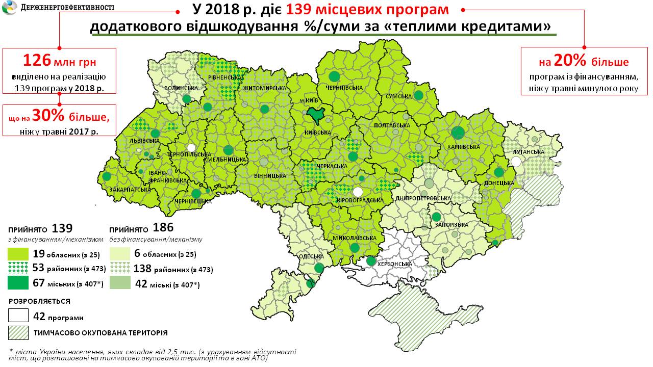 Загалом, лише за 5 місяців 2018 р. у співпраці з Агентством запроваджено 139 місцевих профінансованих програм (19 обласних, 53 районних, 67 міських). На їхню реалізацію у місцевих бюджетах виділено понад 126 млн грн, що на 30% більше у порівнянні із аналогічним періодом минулого року (89 млн гривень).