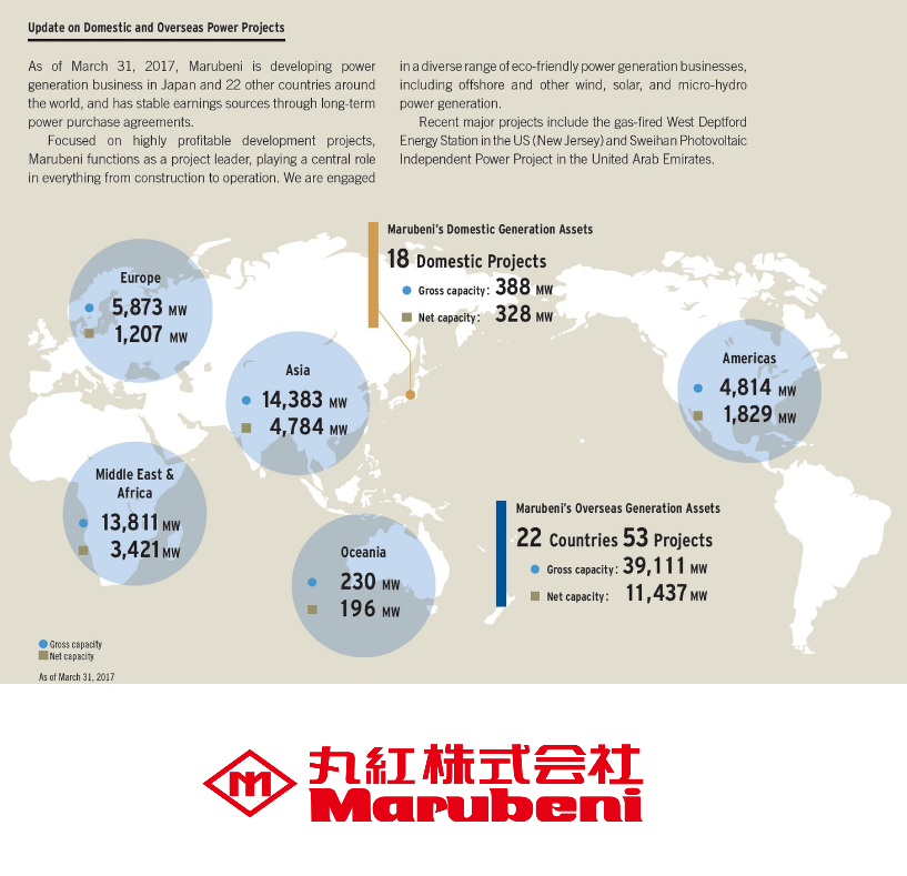 Корпорація «Марубені» має понад 100-річну історію роботи у різних секторах економіки та більше 100 філіалів і офісів у 67 країнах світу. У своїй діяльності компанія також активно впроваджує низку проектів із використанням відновлюваних джерел енергії.