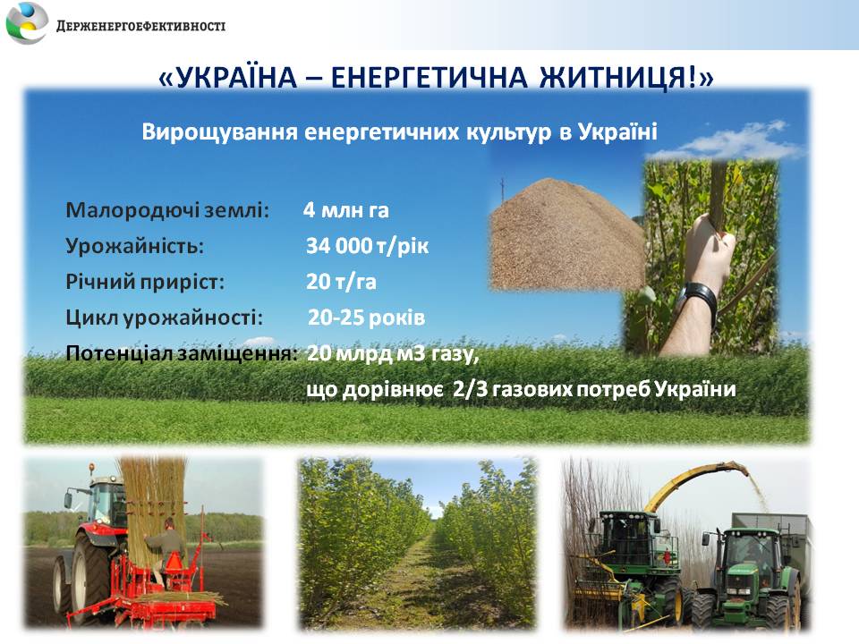 При використанні 4 млн га таких малородючих земель для вирощування енергетичної верби, тополі, міскантусу тощо, подальшій їх переробці для спалювання в котлах, можна досягти заміщення близько 20 млрд м3 газу щорічно.