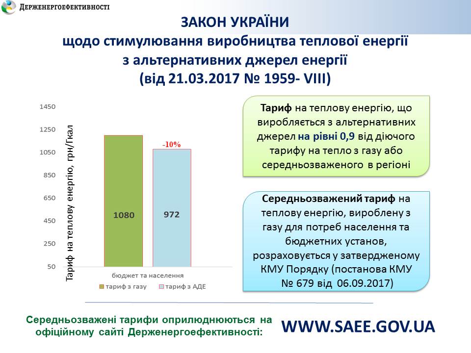 Нагадуємо, що Законом України від 21.03.2017 № 1959-VIII щодо стимулювання виробництва теплової енергії з альтернативних джерел (http://zakon2.rada.gov.ua/laws/show/1959-19) запроваджено спрощену та прозору процедуру встановлення тарифів на тепло «не з газу».