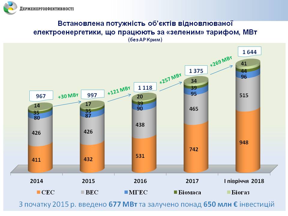 Загалом, з початку 2015 р. по кінець ІІ кварталу 2018 р. введено в експлуатацію 677 МВт потужностей відновлюваної електроенергетики, у встановлення яких інвестовано понад 650 млн євро. Зокрема, за «зеленим» тарифом введено: