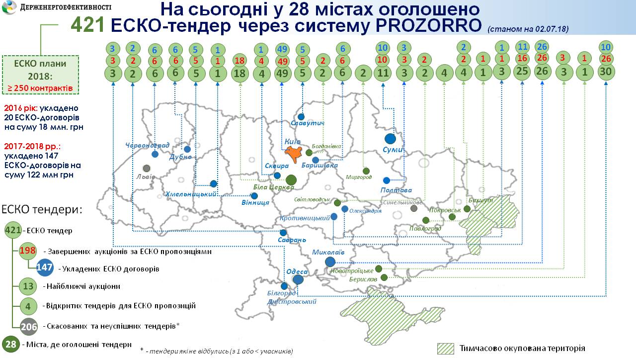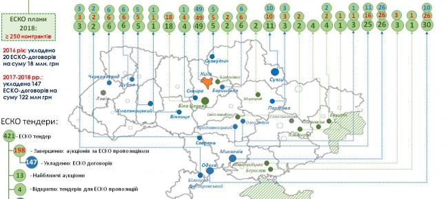 «ЕСКО-механізм набирає стрімких обертів. Як тільки ми запровадили спеціальний модуль для ЕСКО-тендерів у Системі електронних публічних закупівель «PROZORRO» (https://prozorro.gov.ua), із жовтня 2017 р. і по сьогодні, фактично за півроку, оголошено 421 аукціон, а укладено вже 147 контрактів», - окреслив ситуацію С.Савчук.