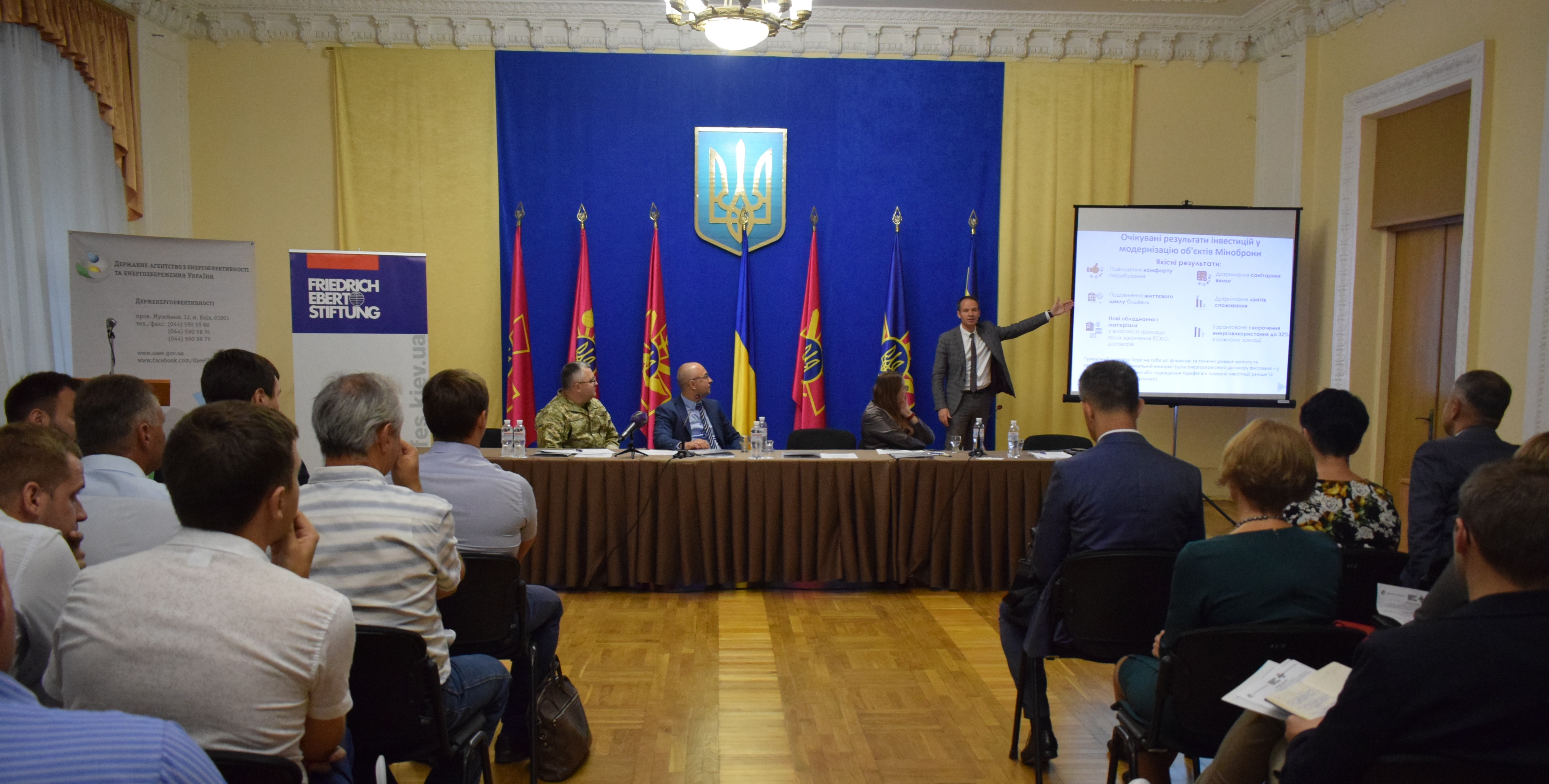 12 07 2018Вигоду від впровадження ЕСКО-проектів не лише у бюджетних закладах, а й на військових об’єктах презентував Голова Держенергоефективності Сергій Савчук представникам установ та організацій, підпорядкованих Міноборони (http://www.mil.gov.ua), у рамках семінару, проведеному Держенергоефективності спільно із Представництвом Фонду ім. Ф.Еберта.