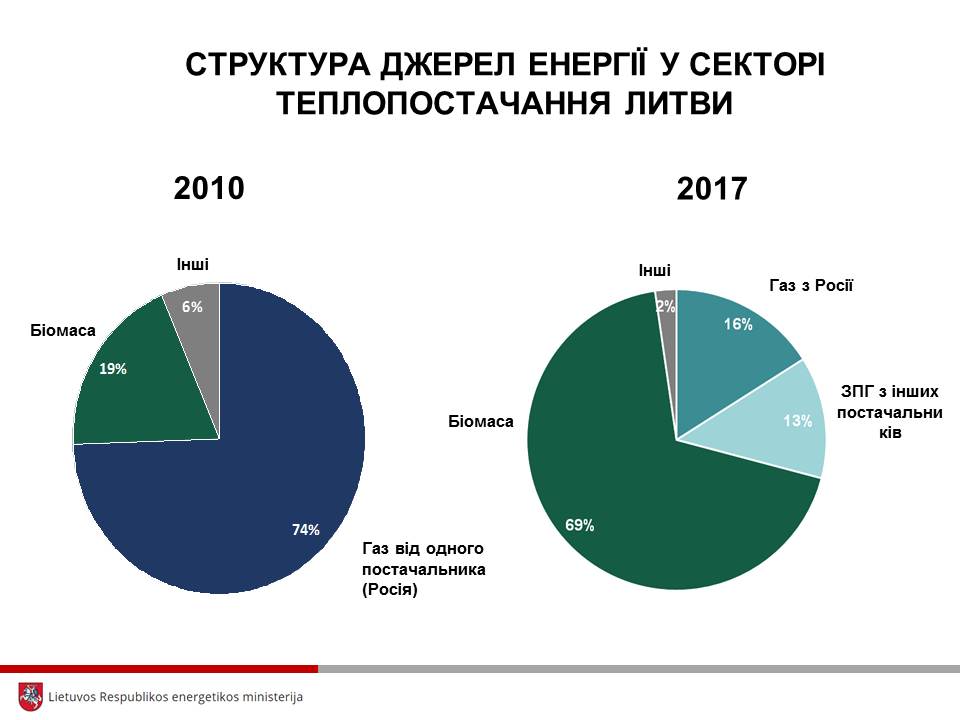 Так, у 2015-17 рр. у Литві середня вартість тепла, виробленого з біомаси, була на 27-35 відс. нижчою, ніж вартість тепла з газу. За рахунок цього у 2017 р. Литва досягла частки біомаси у централізованому теплопостачанні на рівні 68,6 відс. і планує отримати 80 відс. у 2020 р. та 90 відс. у 2030 році.
