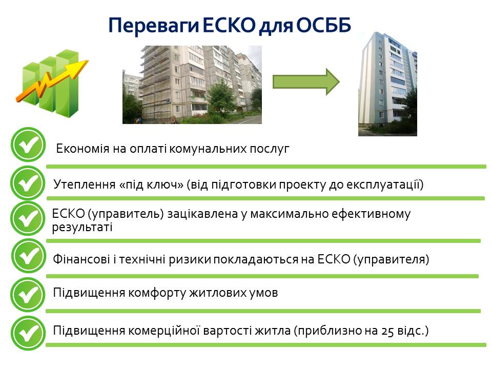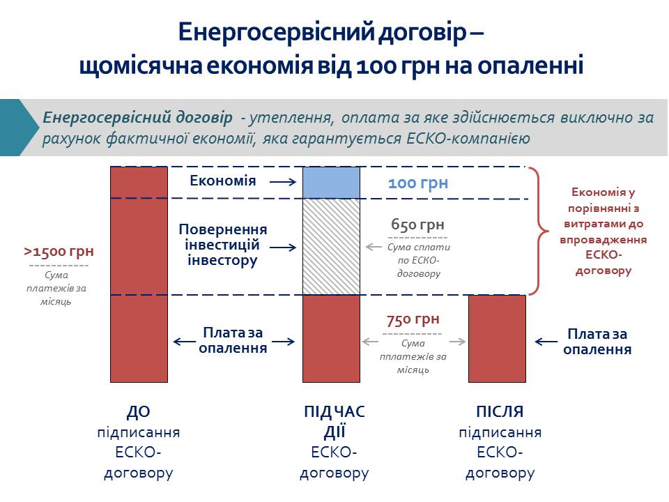 ОСББ, у свою чергу, здійснює всі платежі на користь ЕСКО-компанії лише за умови досягнення зазначеної економії.