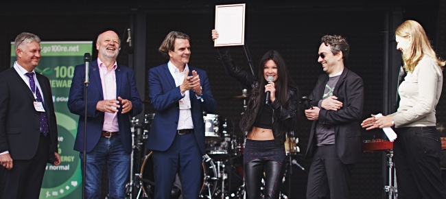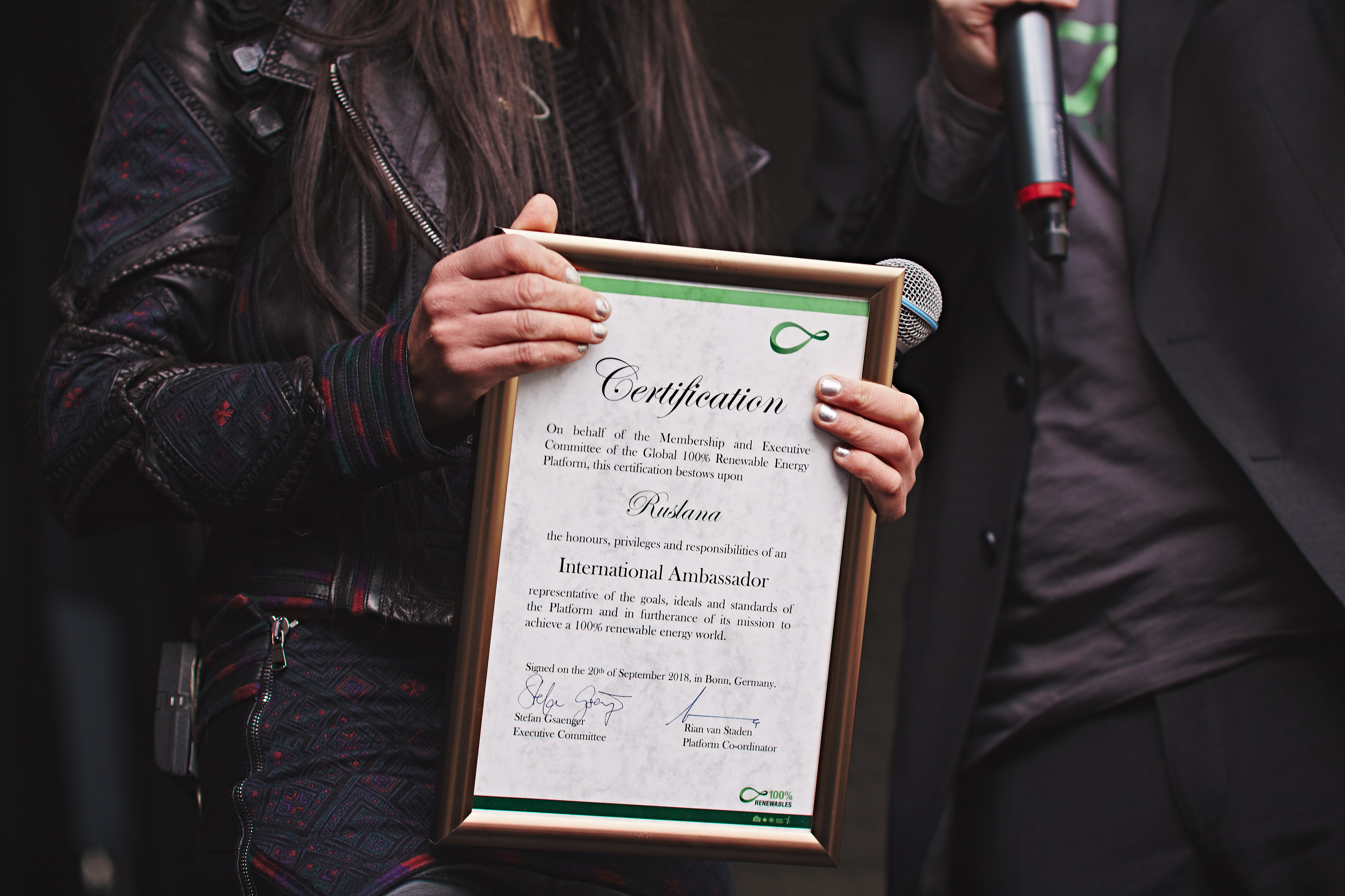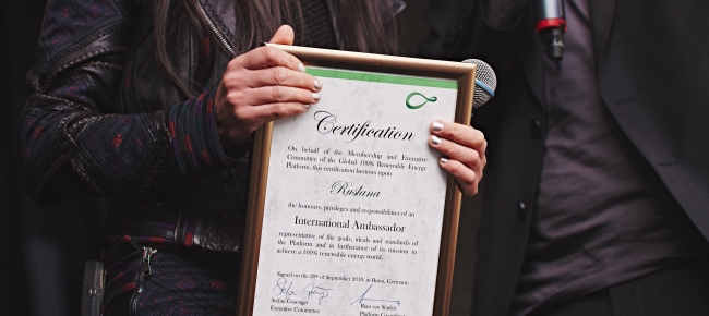 29 09 2018На глобальному саміті «Wind Energy Hamburg 2018» у Гамбурзі (Німеччина) відома українська співачка Ruslana Ambassador отримала відповідний сертифікат ініціативи «Global 100% RE» з рук Стефана Гзенера - генерального секретаря World Wind Energy Association.
