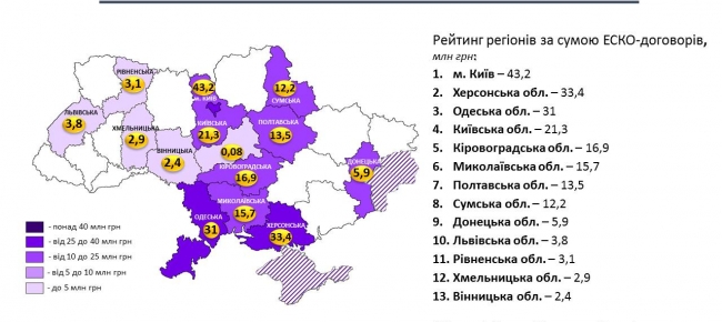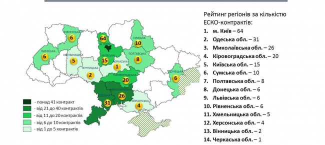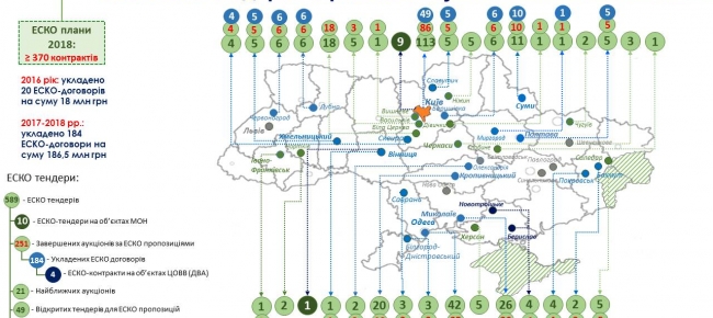 Географія ЕСКО в Україні швидко розширюється. Після запровадження у 2017 р. законодавчих змін, розроблених спільно з Держенергоефективності, у регіонах країни вже укладено 184 ЕСКО-договори на суму більше 200 млн гривень.