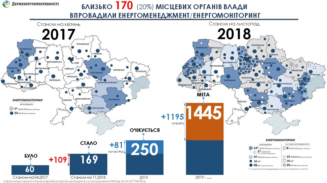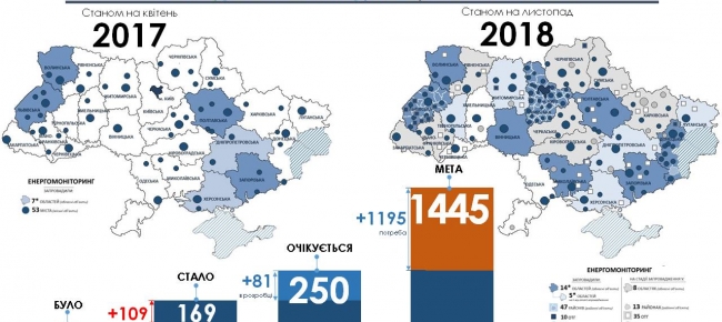 Наразі 80 місцевих органів влади готуються до енергоменеджменту. У 2019 р. очікується, що вже 250 місцевих громад матимуть енергомоніторинг.
