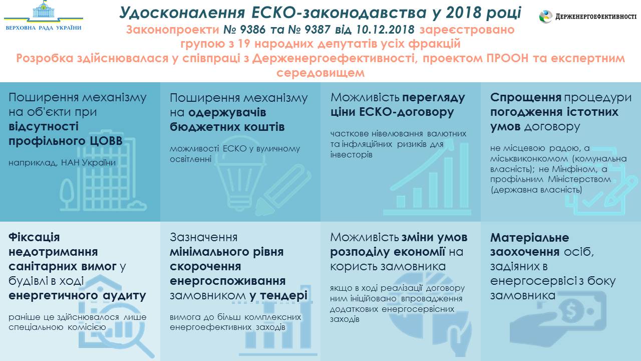 11 12 2018За результатами аналізу реалізації ЕСКО-проектів групою народних депутатів України у співпраці з Держенергоефективності та експертами ПРООН напрацьовано зміни щодо удосконалення ЕСКО-законодавства та вже зареєстровано у Парламенті