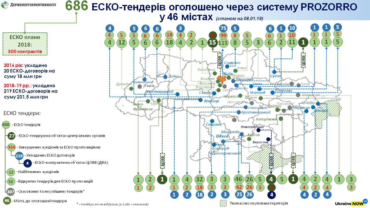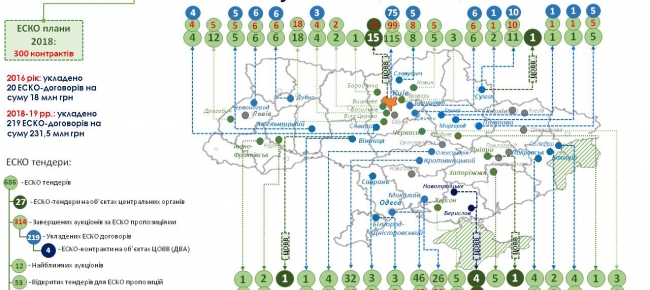2018 рік став проривним для розвитку енергосервісу в Україні. Так, тільки за рік укладено 210 ЕСКО-договорів на суму контрактів 218 млн грн, що у 10 разів більше, ніж у 2016 році. Проекти реалізуються у 12 областях України.