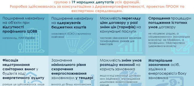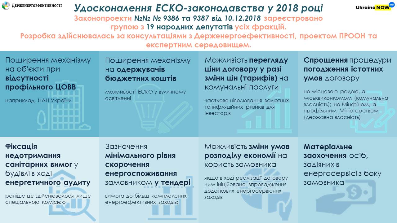 За словами С. Савчука, на сьогодні групою депутатів у співпраці з Держенергоефективності та експертами ПРООН розроблено і зареєстровано у Парламенті законопроекти від 10.12.2018 № 9386  та № 9387 щодо удосконалення ЕСКО-законодавства.