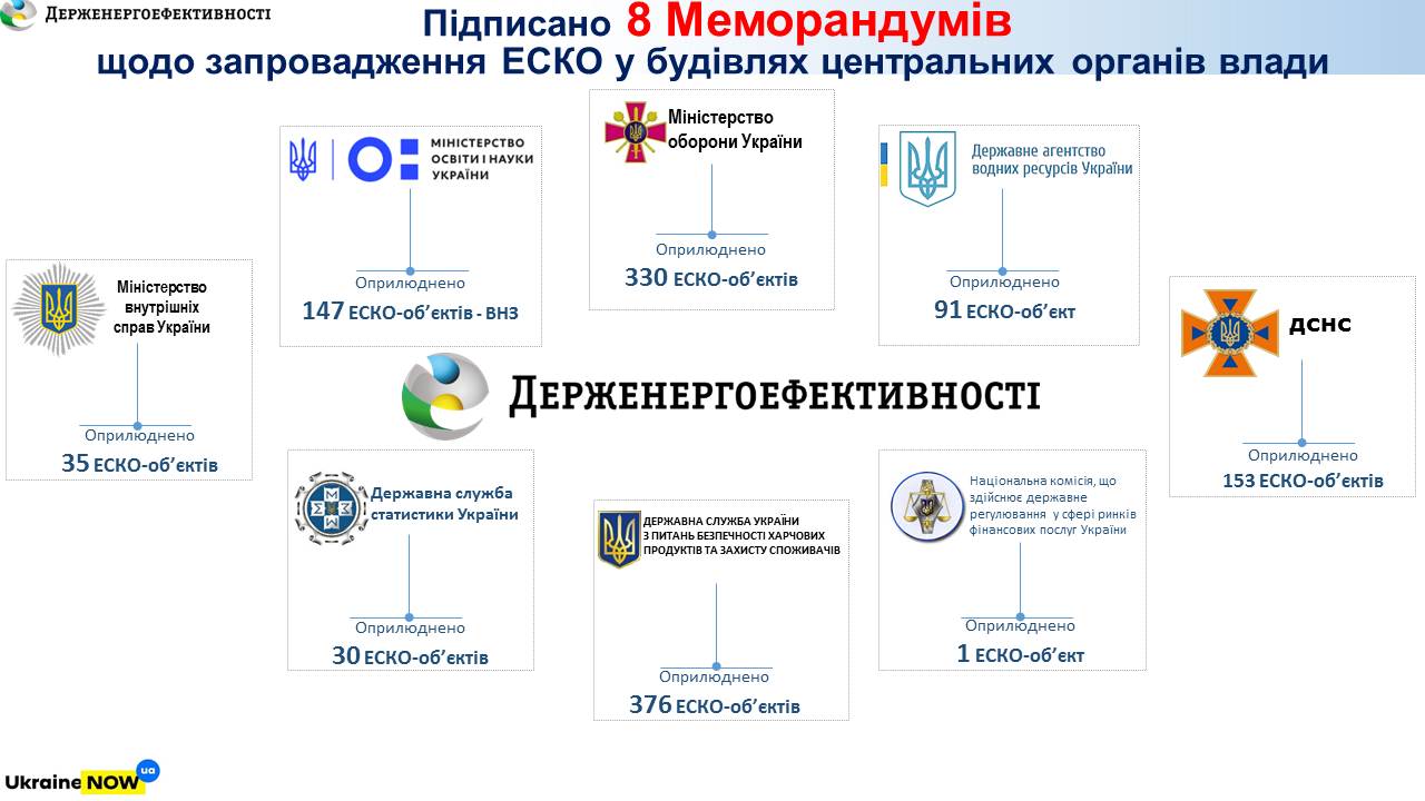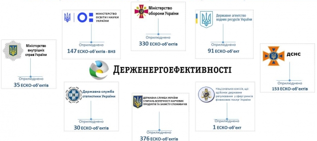 Також оголошено 17 ЕСКО-тендерів щодо об’єктів Міносвіти (КНУ ім. Т.Шевченка Університету харчових технологій, КПІ ім. Сікорського та Національного авіаційного університету) та 11 тендерів щодо об’єктів Держстату.