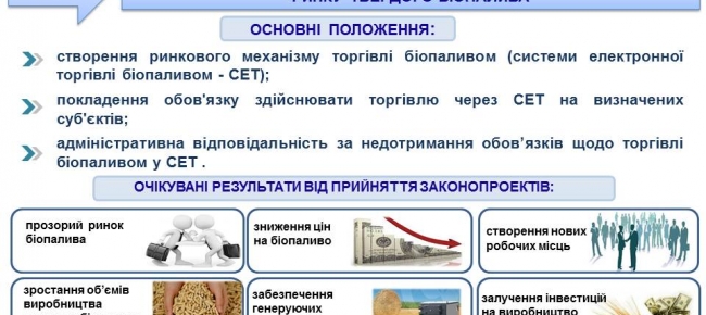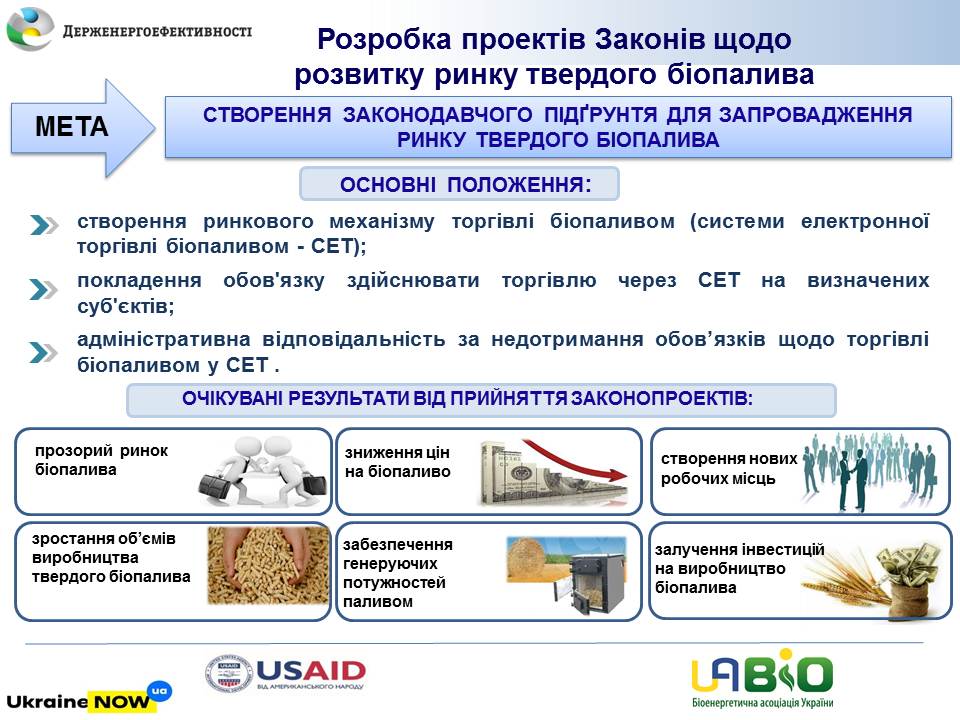 «Зокрема, вважаємо за необхідне створити прозорий і конкурентний ринок твердого біопалива. Відповідний законопроект розроблено із Мінрегіоном, БАУ та проектом USAID «Муніципальна енергетична реформа в Україні»», - повідомив С.Савчук.