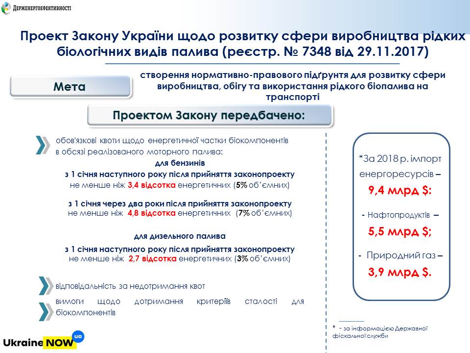 Ще один розроблений законопроект передбачає встановлення квот щодо обов'язкової частки біокомпонентів в загальному обсязі продажу моторного палива на митній території України.