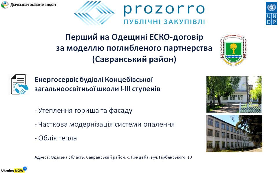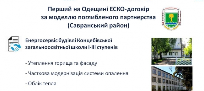 18 02 2019У Савранському районі Одеської області, де у 2016 р. вперше в країні стартував енергосервіс, укладено ЕСКО-контракт за механізмом поглибленого партнерства для термомодернізації Концебівської школи.