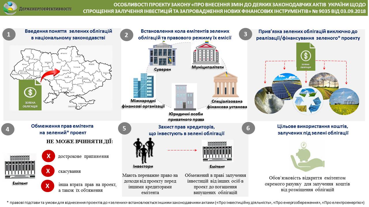 Так, Держенергоефективності спільно з проектом GIZ «Консультування підприємств щодо енергоефективності» та Національної комісії з цінних паперів та фондового ринку вже розроблено законодавчі норми, які утворюють правові засади для емісії зелених облігацій в Україні.