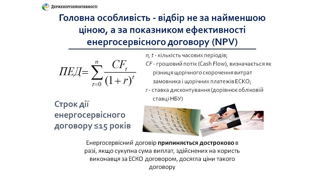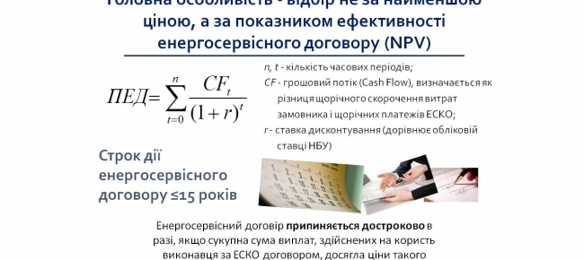 Як пояснив О. Корчміт, важливою особливістю механізму є відбір виконавця робіт не за найменшою ціною, а за показником ефективності енергосервісного договору.