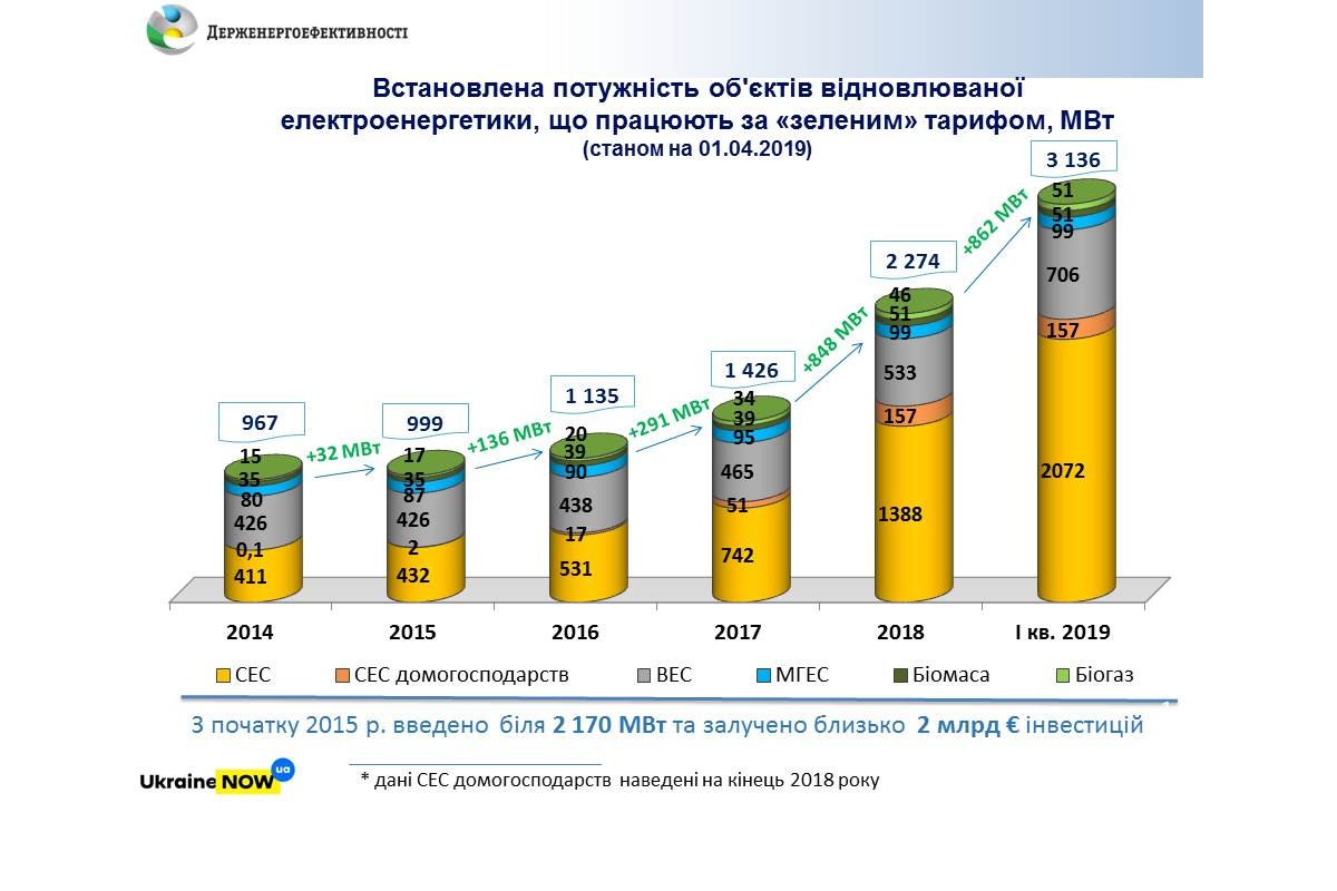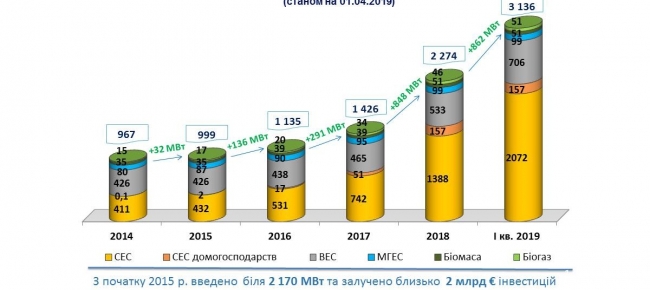Лише за 3 місяці ц. р. введено 862 МВт нових потужностей, що генерують електроенергію з відновлюваних джерел. Це більше, ніж за весь 2018 рік (848 МВт).