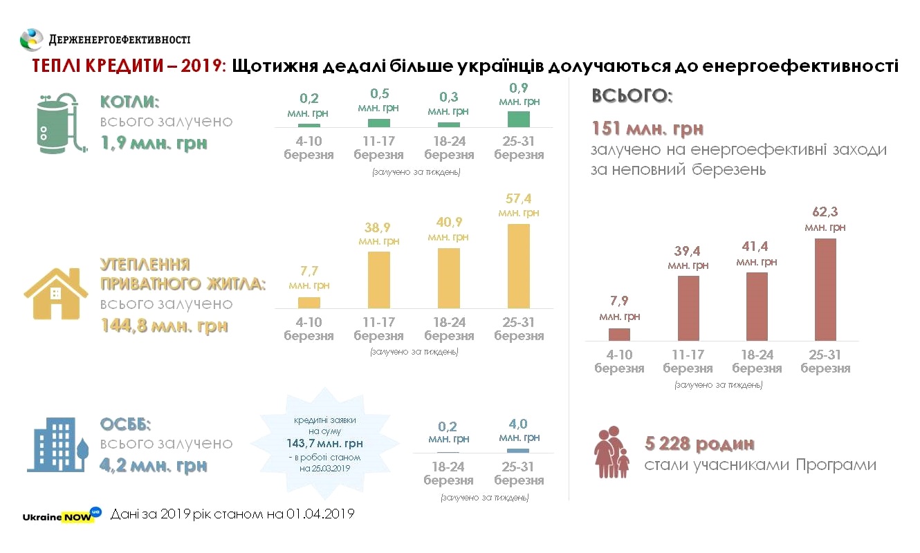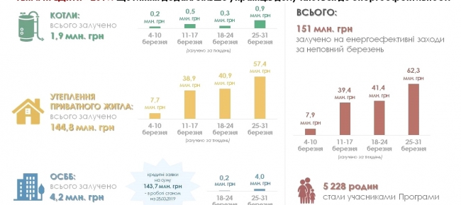 Загалом, за підсумками березня понад 5200 українських родин прийняли рішення на користь енергоефективності своїх осель та залучили 151 млн грн «теплих кредитів».
