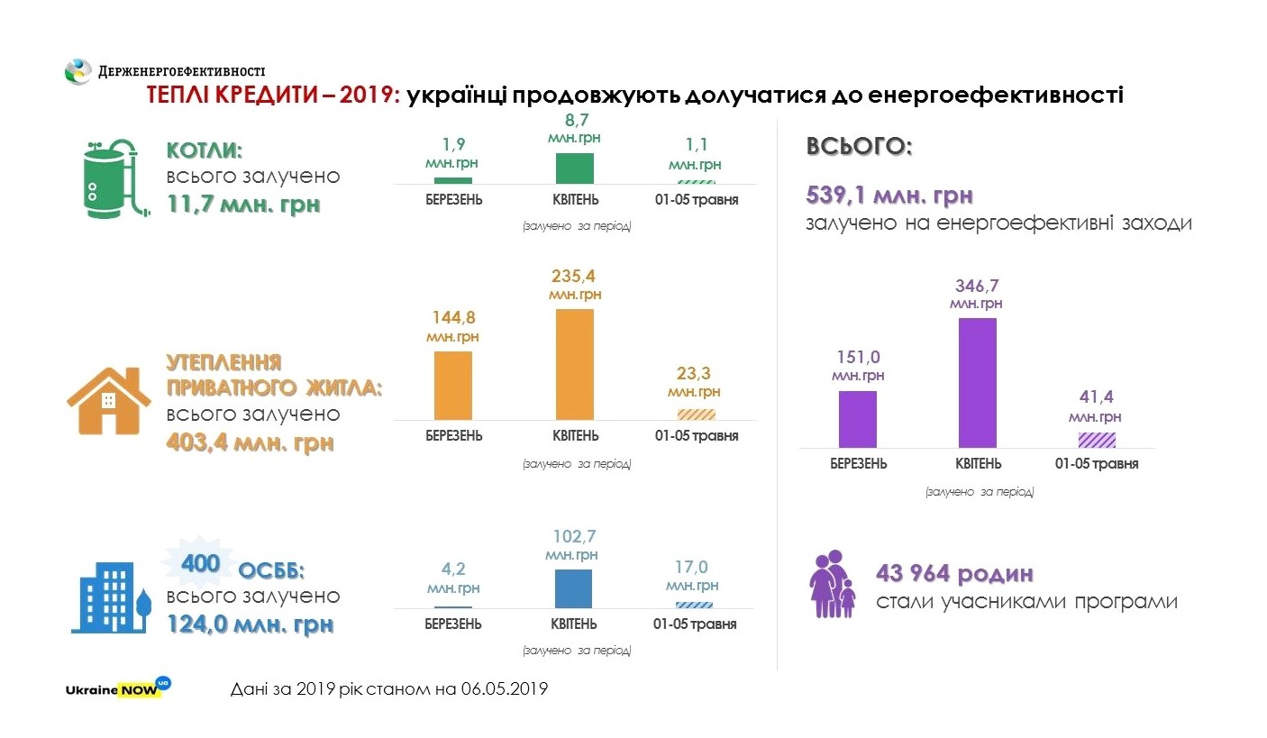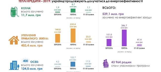Загалом, у 2019 р. близько 43 тис. родин вже отримали в банках 540 млн грн «теплих кредитів». Це більше половини від усього прогнозованого обсягу кредитування у ц.р. – 1,1 млрд грн «теплих кредитів» (за наявного бюджетного фінансування у розмірі 400 млн гривень).