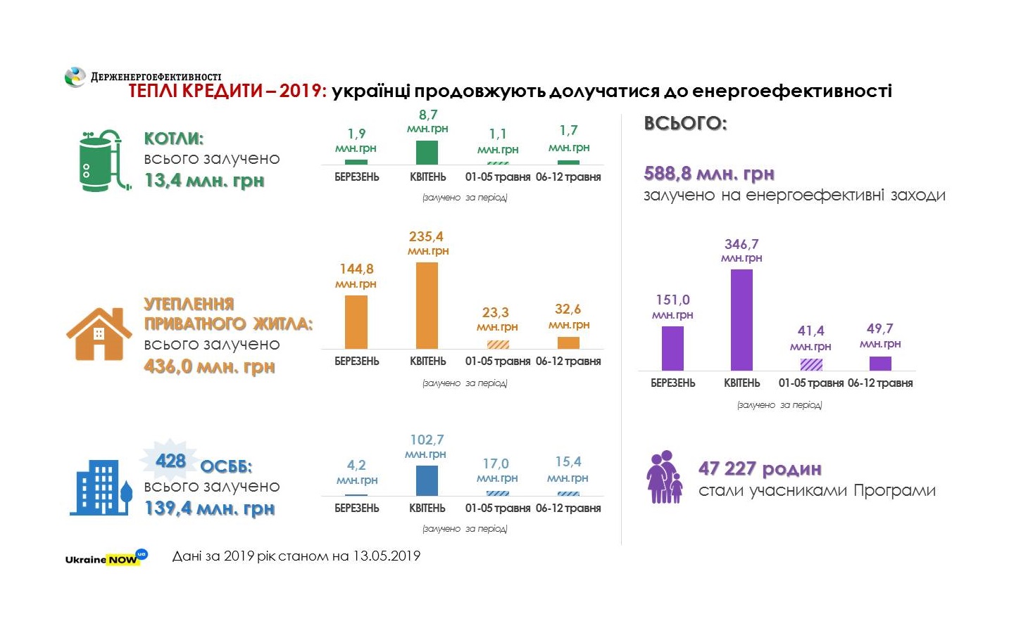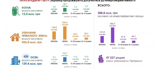 14 05 2019Програма «теплих кредитів» - у самому розпалі. Минулого тижня українські родини залучили ще близько 50 млн грн. «теплих кредитів» для термомодернізації будинків, зокрема: