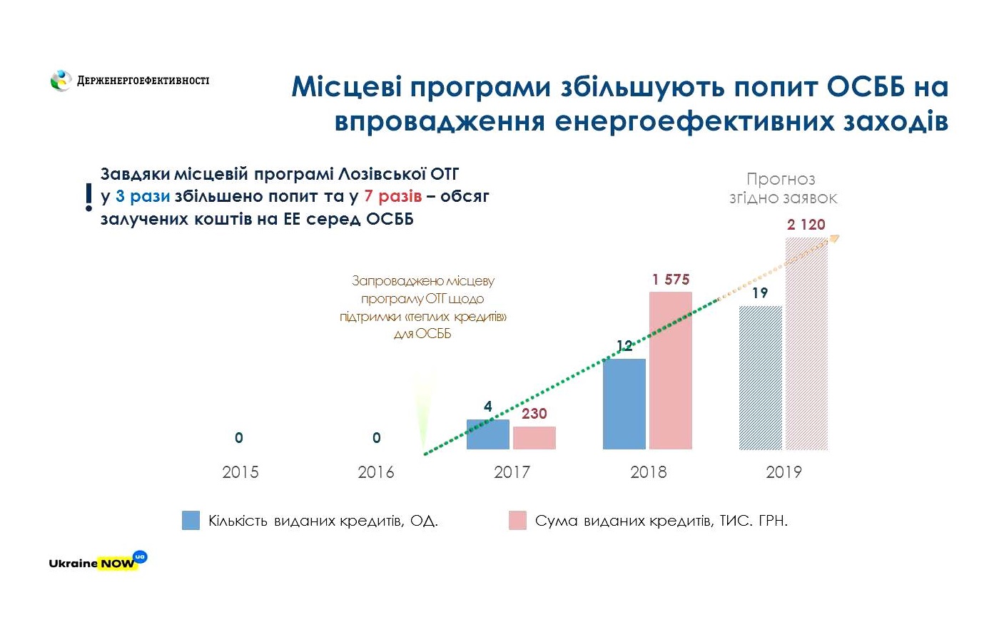Так, у 2016 р. Лозівська ОТГ вперше запровадила місцеву програму відшкодування 30% суми «теплого» кредиту для ОСББ громади.