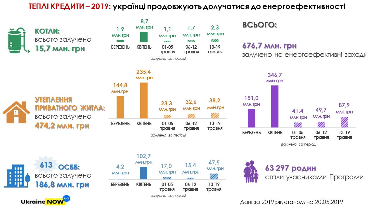 Загалом, у 2019 р. понад 63 тис. родин вже отримали в банках майже 700  млн грн «теплих кредитів». Це дві третини від усього прогнозованого обсягу кредитування у ц. р. – 1,1 млрд грн «теплих кредитів» (за наявного бюджетного фінансування у розмірі 400 млн гривень).