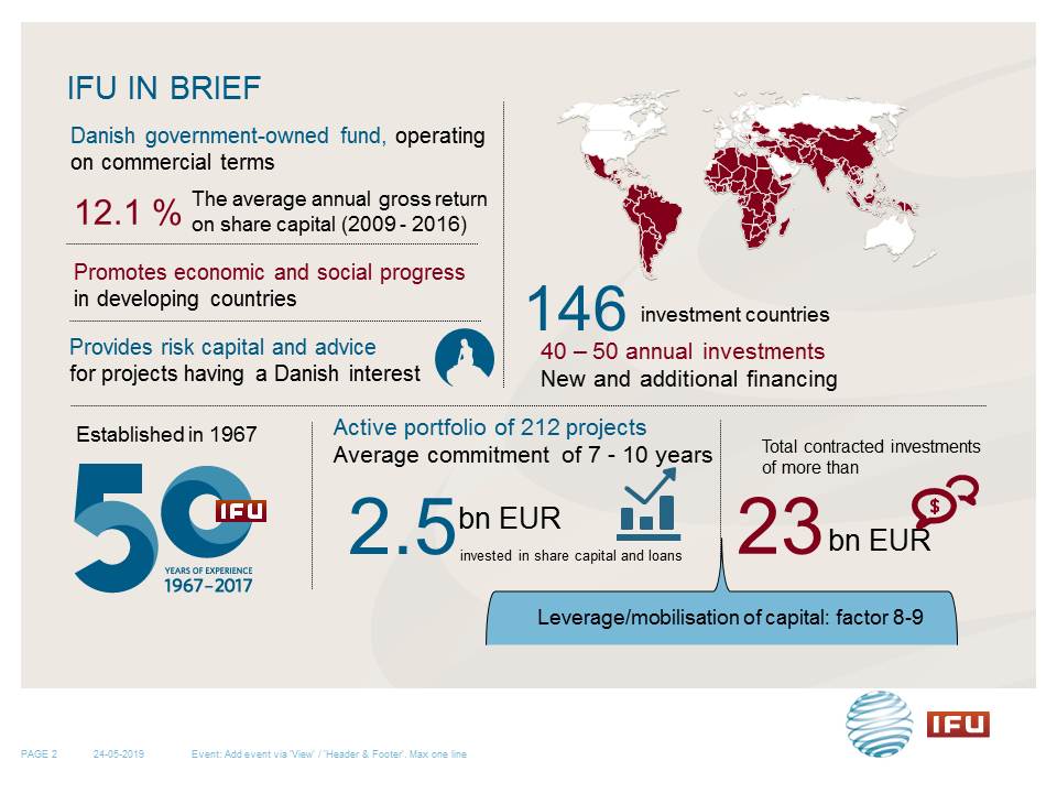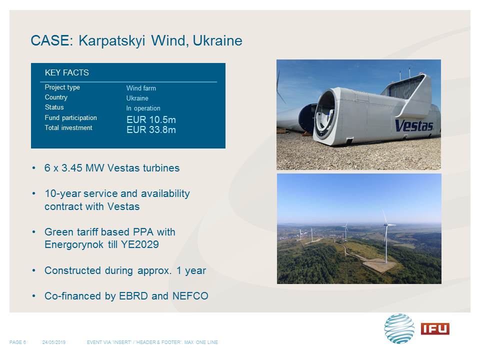 Фонд IFU надає фінансування проектам сталого розвитку у понад 140 країнах світу, у т.ч. в Україні. У відновлюваній енергетиці України IFU зробив внесок у реалізацію таких проектів:
