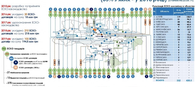«На сьогодні м. Київ є лідером за кількістю та сумою укладених енергосервісних договорів, а саме - 119 контрактів вартістю понад 100 млн гривень. Так, на м. Київ припадає близько 35% усіх ЕСКО-договорів в Україні», - прокоментував Голова Держенергоефективності Сергій Савчук.