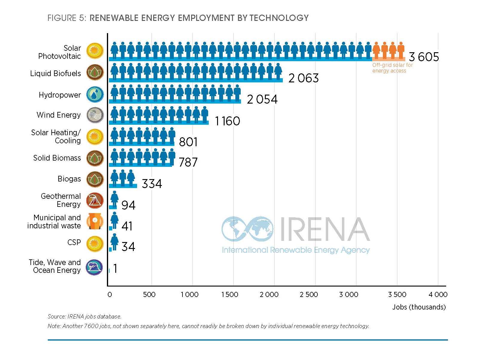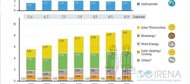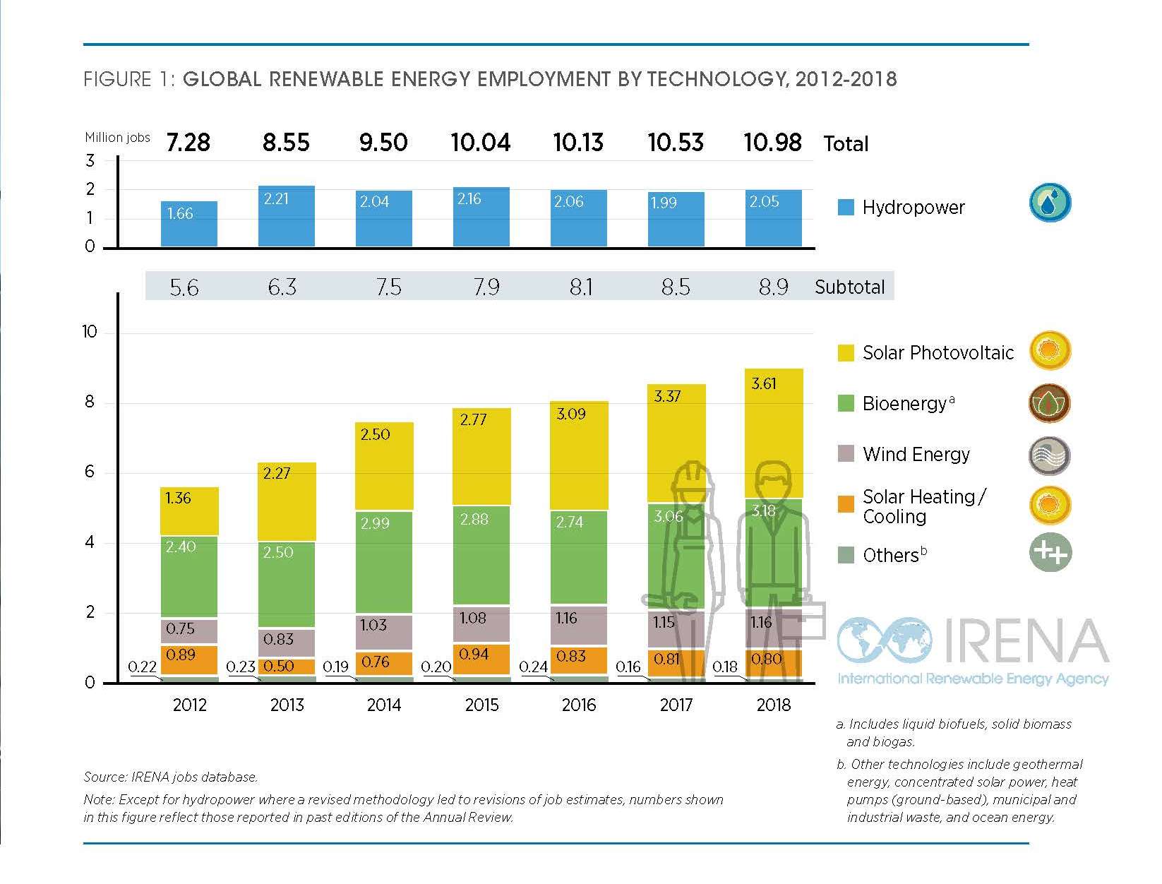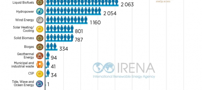 За даними Міжнародного агентства із відновлюваних джерел енергії (IRENA), найбільшу кількість працівників задіяно у таких секторах: