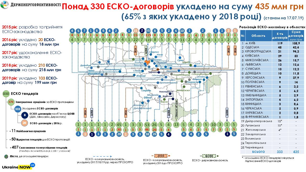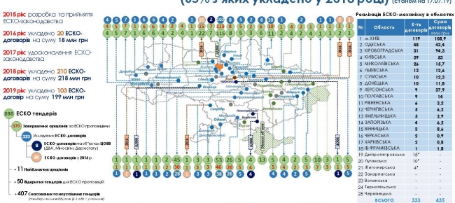 На сьогодні понад 330 ЕСКО-договорів вартістю контрактів більше 430 млн грн підписано вже у 18 регіонах країни.