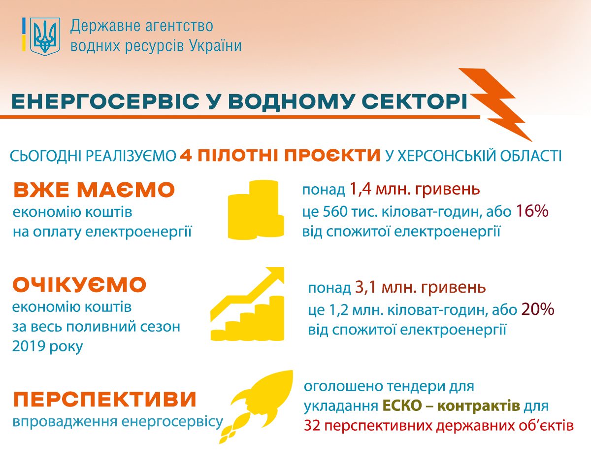За даними Держводагентства, впровадження перших 4-х ЕСКО-контрактів на насосних станціях у Херсонській області на початку літа ц.р. дозволило зменшити споживання електроенергії на 15%. Це близько 1,4 млн грн заощаджених коштів лише за червень-липень цього року. Планується досягти 20% річної економії енергоспоживання на цих об’єктах.