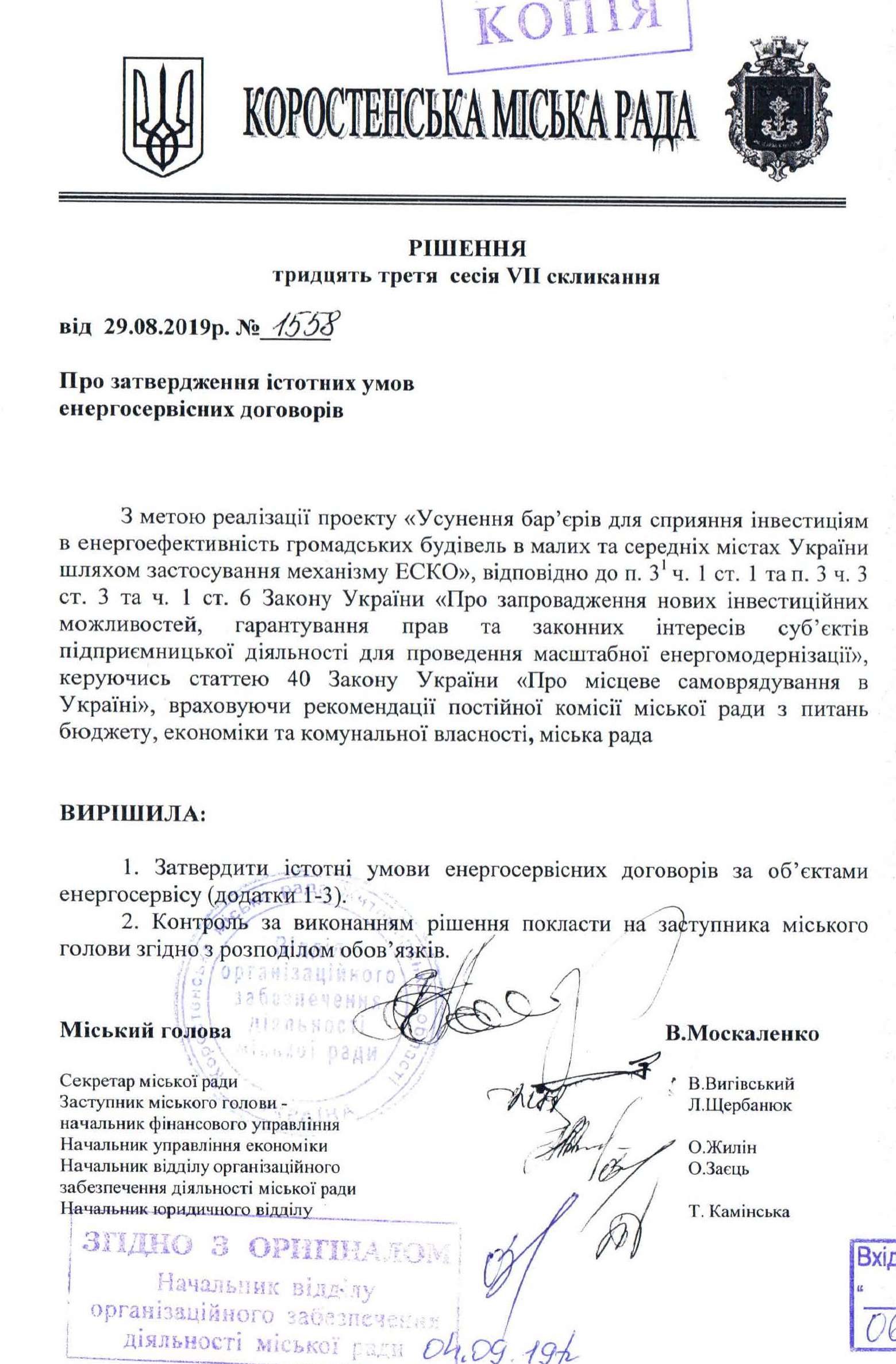 15 09 2019Коростенська міська рада затвердила істотні умови ЕСКО-договорів для 3-х освітніх закладів: