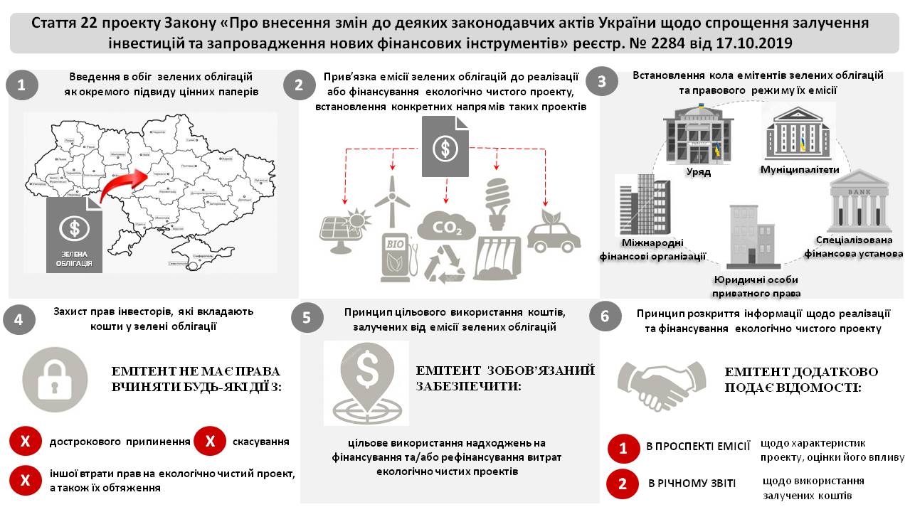 24 10 2019У Парламенті зареєстровано законопроект № 2284 від 17.10.2019, яким передбачається запровадження зелених облігацій в Україні та встановлення правил для учасників цього ринку (http://w1.c1.rada.gov.ua/pls/zweb2/webproc4_1?pf3511=67117).