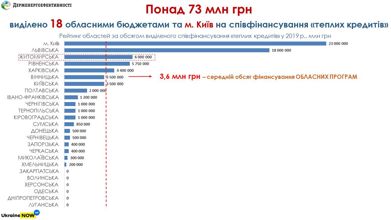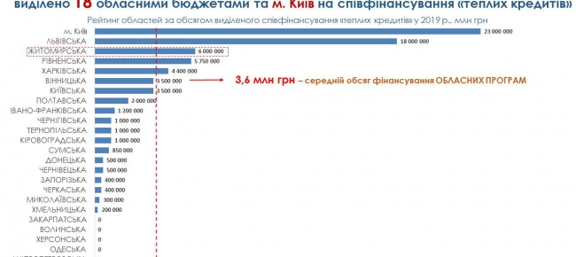 У результаті Житомирська область входить у трійку регіонів-лідерів за обсягом співфінансування «теплих кредитів» - 6 млн грн у 2019 році.