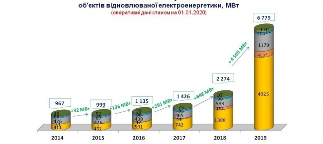 У 2019 р. близько 3,7 млрд євро інвестовано у рекордні 4500 МВт потужностей відновлюваної електроенергетики в Україні.